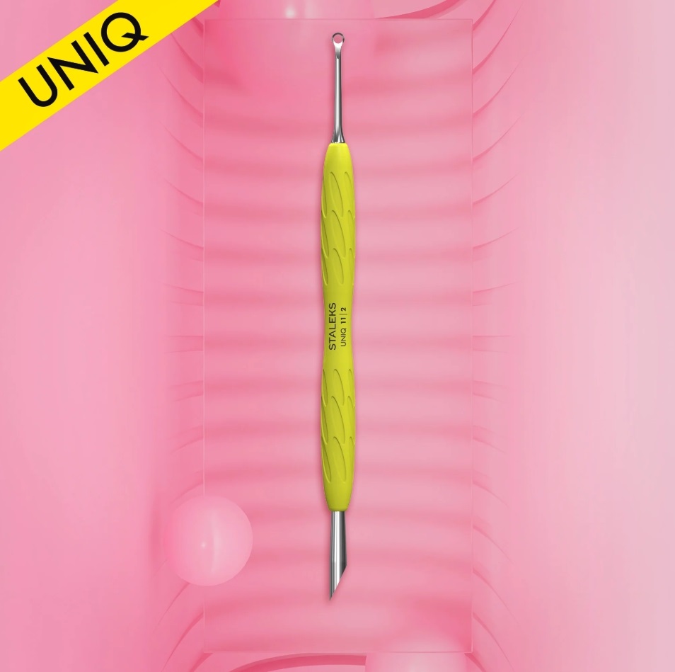 Staleks "Gummy" Uniq 11 TYPE 2 zatlačovač nechtovej kožičky PQ-11/2Y so šikmým zatlačovačom v tvare "pomarančového dreva" a krúžkom prináša spojenie pohodlia a presnosti v jedinečnom dizajne. Kľúčovým prvkom zatlačovača "Gummy" je jeho silikónová rukoväť, ktorá poskytuje spoľahlivý úchop nástroja a umožňuje efektívnejšiu prácu bez únavy. Prítomnosť hypoalergénnej silikónovej rukoväte spolu s kovovou pracovnou časťou vytvára ideálnu kombináciu pohodlia a funkčnosti. Profesionálne ručné ostrenie pracovných častí zabezpečuje precíznu a odbornú prácu. Krúžok je určený na bezpečné odstránenie prerastenej kožičky z povrchu nechtov. Nástroj je vhodný pre dezinfekciu špeciálnymi prostriedkami a sterilizáciu v suchej peci alebo autokláve bez straty kvality, a je určený pre použitie pri manikúre a pedikúre.